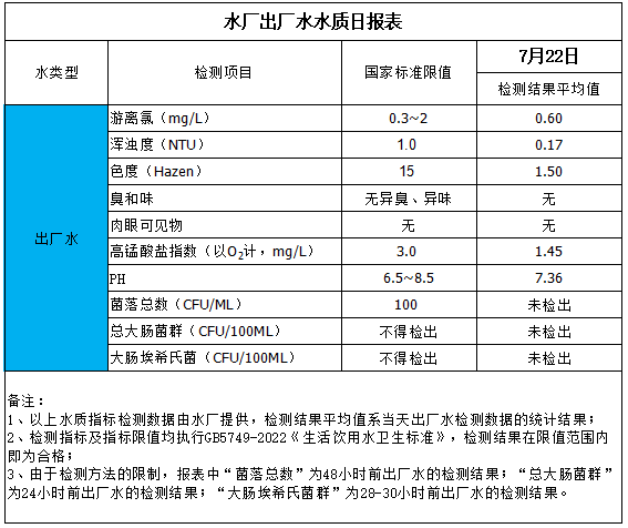 水廠出廠水水質日報表(2025-7-22)