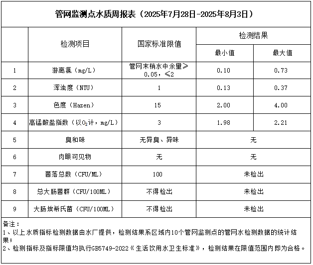 管網監測點水質周報表(2025年7月28日-2025年8月3日)