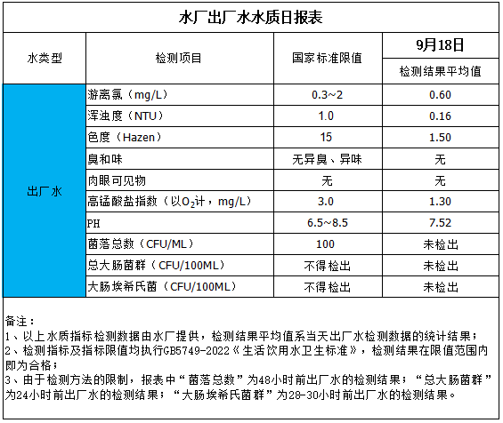 水廠出廠水水質日報表(2025-9-18)