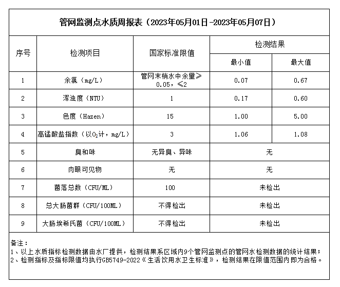 管網監測點水質周報表(2023年05月01日-2023年05月07日)