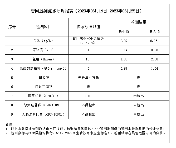 管網(wǎng)監(jiān)測點水質(zhì)周報表(2023年06月19日-2023年06月25日)