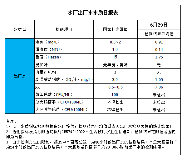 水廠出廠水水質日報表(2023-6-29)