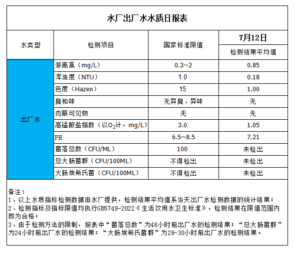 水廠出廠水水質(zhì)日?qǐng)?bào)表(2023-7-12)
