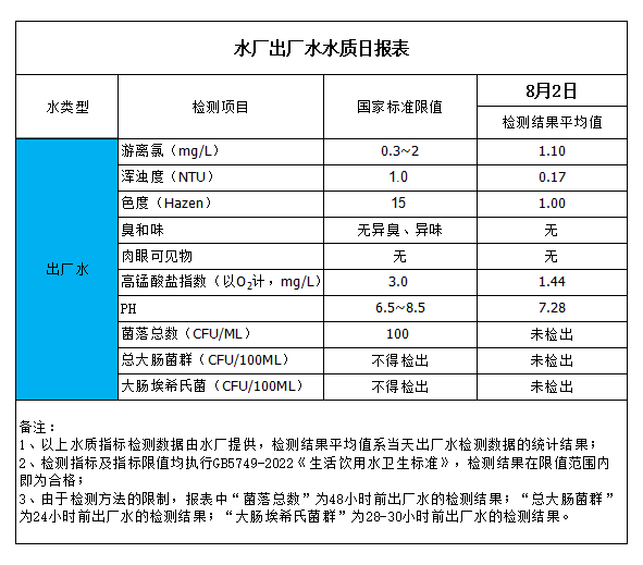 水廠出廠水水質日報表(2023-8-2)
