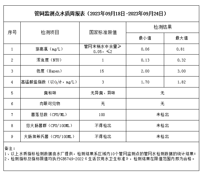 管網監(jiān)測點水質周報表(2023年09月18日-2023年09月24日)