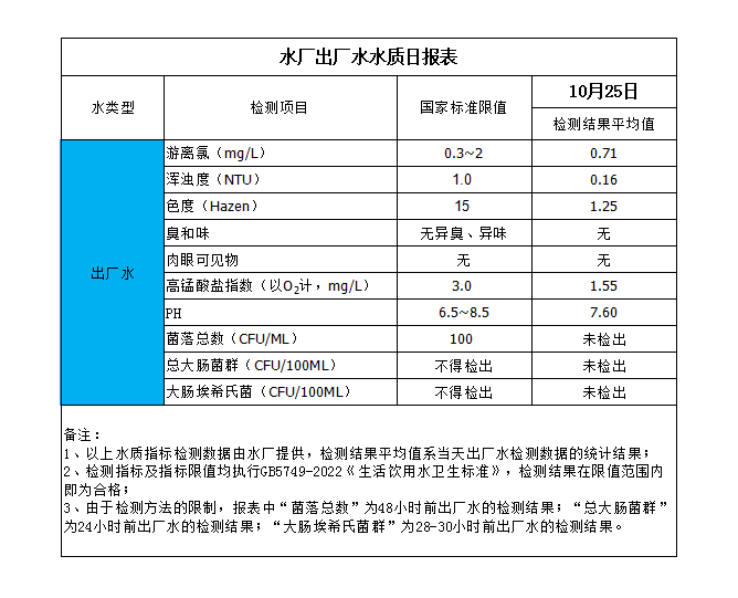 水廠出廠水水質(zhì)日?qǐng)?bào)表(2023-10-25)