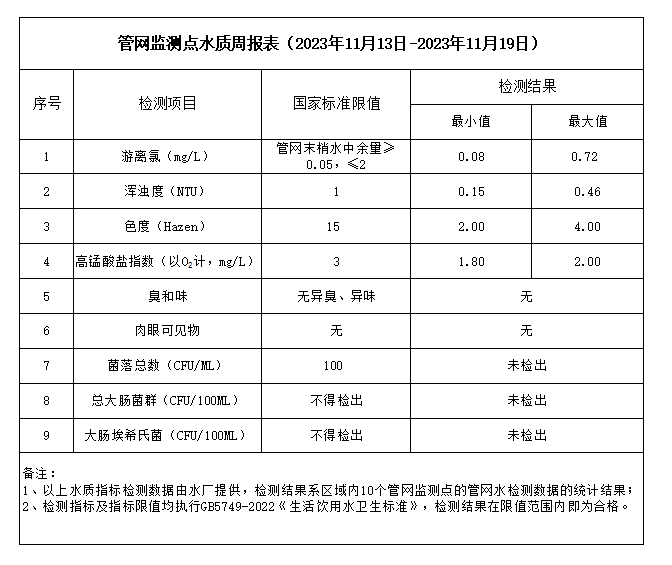 管網監測點水質周報表(2023年11月13日-2023年11月19日)