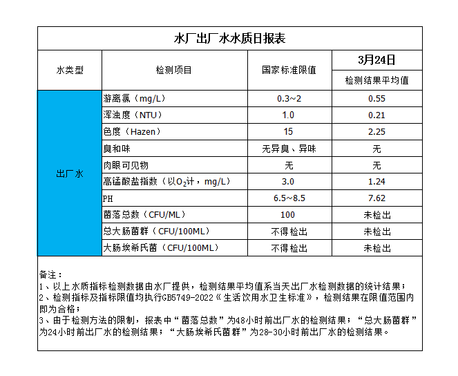 水廠出廠水水質日報表(2024-3-24)