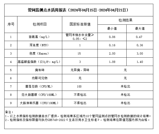 管網(wǎng)監(jiān)測(cè)點(diǎn)水質(zhì)周報(bào)表(2024年04月15日-2024年04月21日)